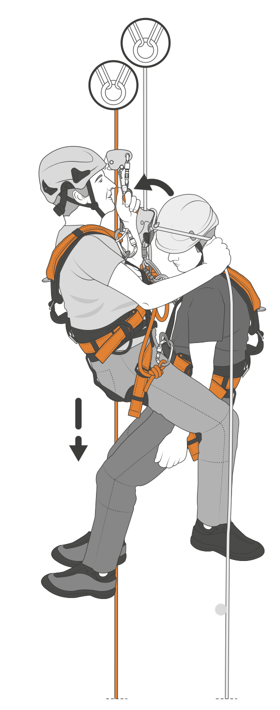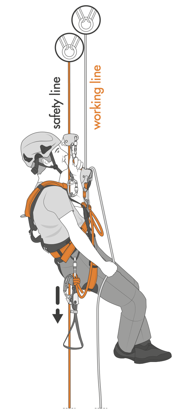 De touw technicus is ten alle tijden bevestigd aan twee onafhankelijke anker punten. Een touw technicus kan zowel afdalen als klimmen.